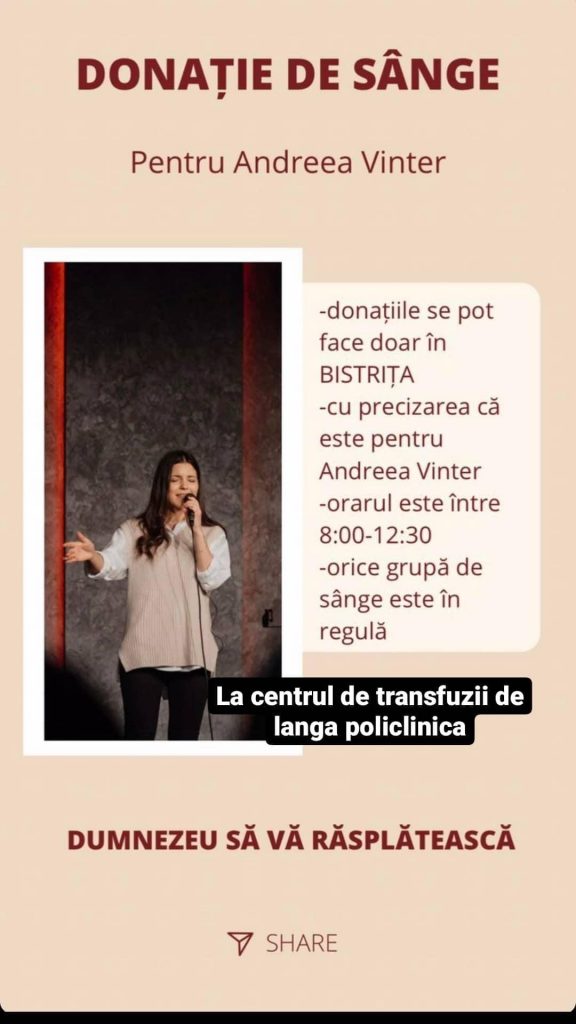Andreea Vinter, tânăra din Oradea care a fost rănită grav în accidentul din Șintereag, are nevoie de sânge. Tânăra este internată în spital, în stare foarte gravă și are nevoie de mai multe intervenții chirurgicale, dar și de transfuzii de sânge.