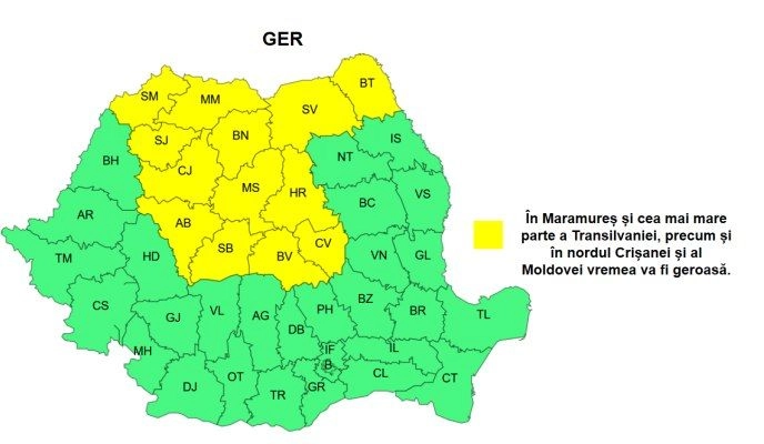 În Maramureș și în cea mai mare parte a Transilvaniei, precum și în nordul Crișanei și al Moldovei, vremea va fi geroasă. Temperaturile minime se vor încadra, în general, între -19 și -9 grade, cu cele mai scăzute valori în estul Transilvaniei.