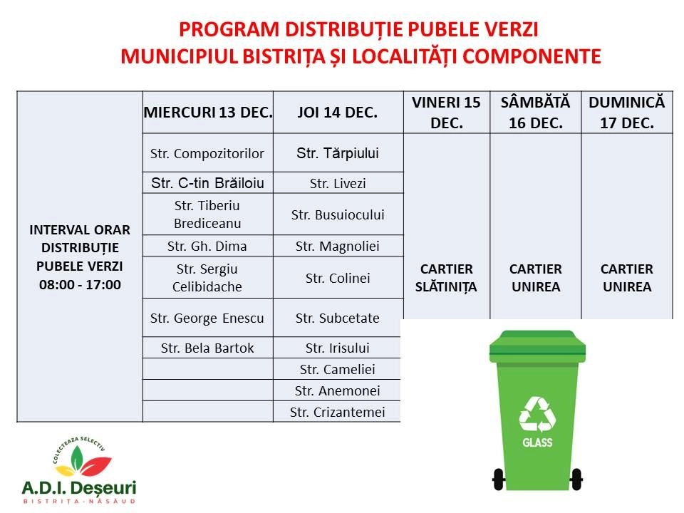 Program distribuție pubele verzi în zonele de case din Municipiul Bistrița și localitățile componente!