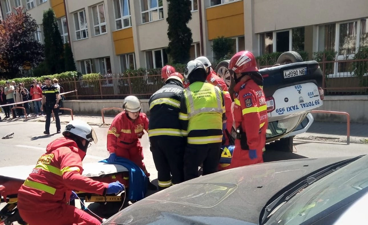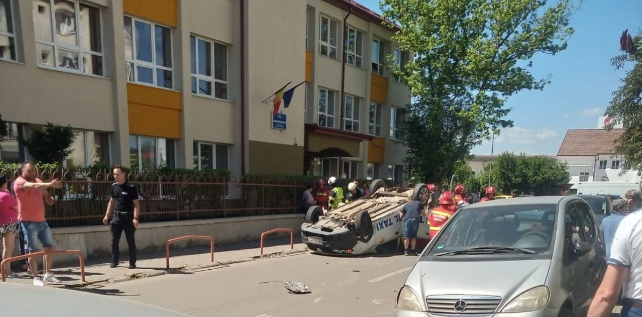 Accident rutier în Bistrița. O mașină de taxi s-a răsturnat (FOTO)