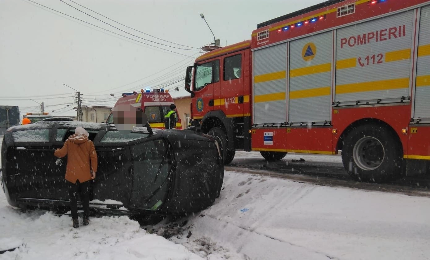 Accident rutier! O mașină, în care se aflau patru persoane, s-a răsturnat
