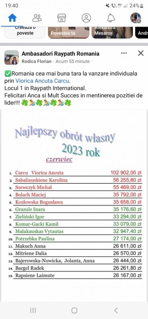 "Am fost pe locul doi, imediat după ce am început să vând produse Raypath și acum sunt pe locul 1, la nivel internațional. Adică, luna trecută, am vândut marfă de peste 22.000 de euro, de la Raypath International. Am fost felicitată și premiată de conducerea companiei", a spus Anca Cârcu, care a depășit cu peste 50 la sută vânzărilor celorlalți reprezentanți.