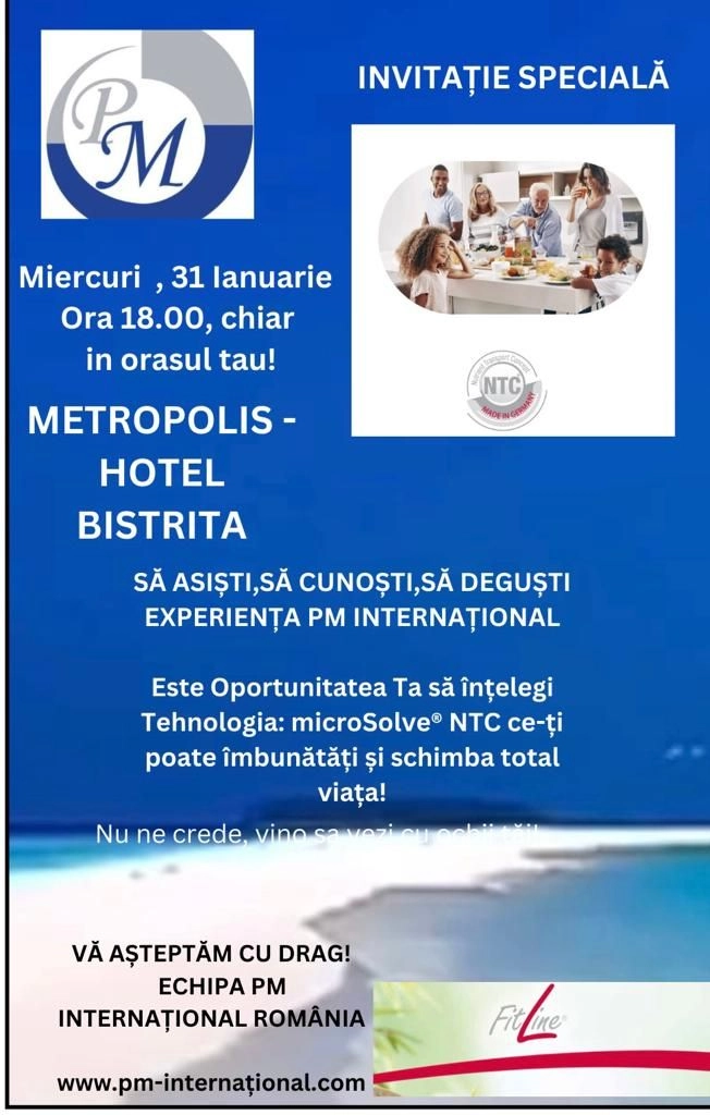 Un eveniment important va avea loc în această seară, la ora 18.00, la Hotel Metropolis din Bistrița. PM International va avea o prezentare cu produse la Bistrița, eveniment la care sunt invitați bistrițenii, intrarea fiind liberă.