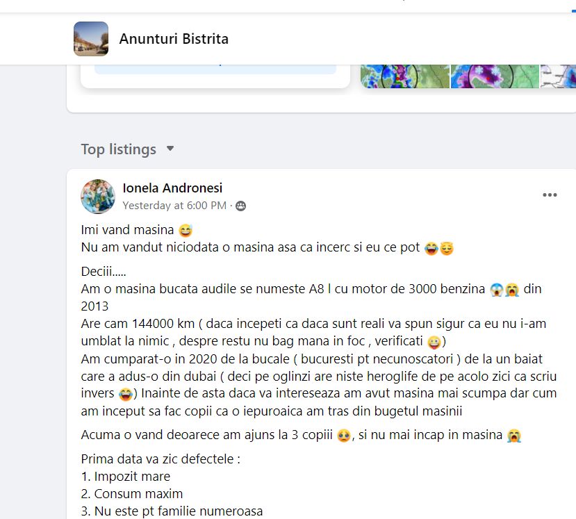 Anunțul unei bistrițence care își vinde mașina a devenit viral, după ce a fost postat pe un grup de Facebook. Tânăra anunță într-un mod inedit că își vinde autoturismul. “Am o masina bucata audile se numeste A8 l cu motor de 3000 benzina din 2013. Are cam 144000 km ( daca incepeti ca daca […]