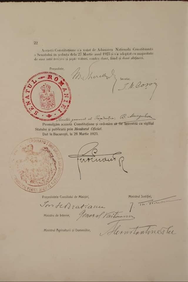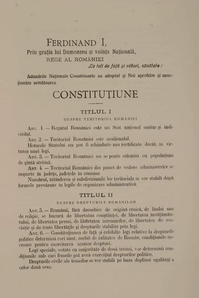 Pe 29 martie 1923 apărea în Monitorul Oficial nr. 282 textul unei noi Constituţii a României. Printre principalele prevederi: ţara noastră era monarhie constituțională, România era stat național, unitar, indivizibil, cu teritoriul inalienabil. Constituția consfințește realizarea României Mari și are la bază în linii mari prevederile Constituției din anul 1866, 78 din cele 138 de articole ale noii Constituţii fiind neschimbate.