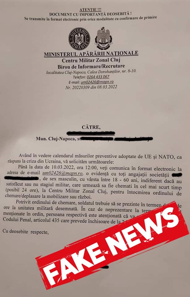 Vă semnalăm noi tentative de răspândire de documente și informații false în legătură cu așa-zise demersuri ale MApN pentru pregătirea mobilizării rezerviștilor. Documentele din imagini, care au fost distribuite în municipiile Cluj-Napoca și Brașov, reprezintă falsuri. În legătură cu acestea, au fost sesizate autoritățile judiciare. Precizăm cât se poate de clar că Ministerul Apărării Naționale […]