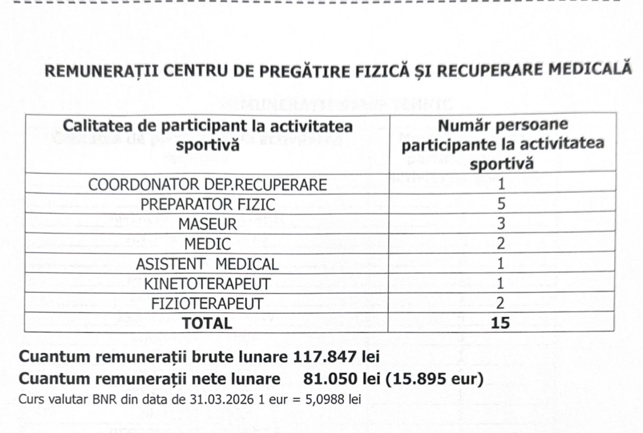 De asemenea, Gloria Bistrița are 15 persoane plătite la Centrul de Pregătire Fizică și recuperare medicală (medic, preparator fizic, maseur, kinetoterapeut, fizioterapeut), plătite cu suma totală netă lunară de 15.000 de euro. Și aici, salariile diferă.