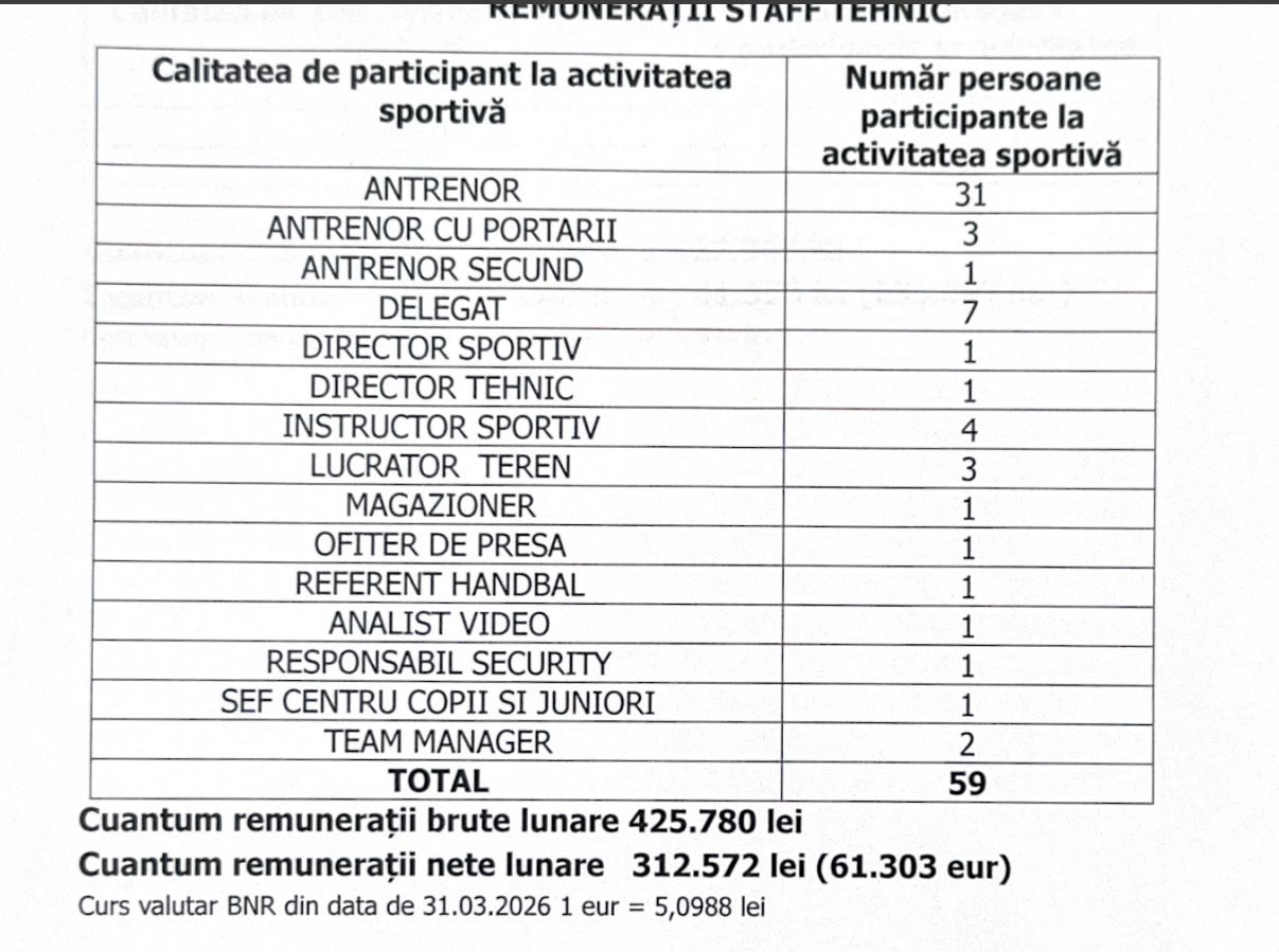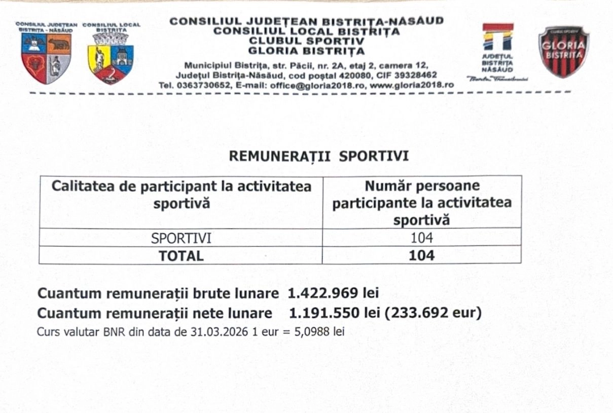 Clubul Sportiv CS Gloria Bistrița revine în centrul atenției publice, după apariția unor date oficiale care arată cât se cheltuie pe salarii. În spatele performanțelor sportive se află un aparat extins: 104 sportivi și 59 de membri ai staff-urilor tehnice, plus 15 persoane din cadrul centrului de pregătire fizică și recuperare.