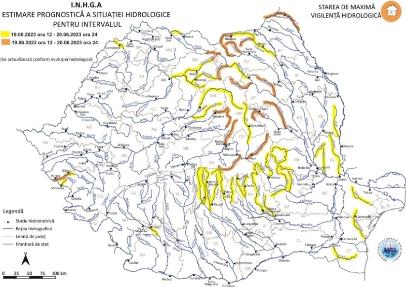 În intervalul 19.06.2023 ora 12:00 – 20.06.2023 ora 24:00 pe râurile din bazinele hidrografice: Tisa – pe sectorul aferent S.H. Valea Vişeului (intrarea în ţară), Someşul Mare (judeţul Bistriţa Năsăud), Crasna – curs inferior (judeţul Satu Mare), Mureş – bazin amonte S.H. Glodeni, Niraj (judeţele: Harghita şi Mureş), Târnava Mică – bazin superior şi afluenţi bazin mijlociu şi inferior (judeţele: Harghita, Mureş şi Alba), Târnava Mare – bazin superior şi afluenţi bazin mijlociu şi inferior (judeţele: Harghita, Mureş, Alba, Braşov şi Sibiu), Bârzava – sector aval confluenţă cu râul Fizeş, Moraviţa – curs inferior (judeţele: Caraş Severin şi Timiş), Jiu – pe sectorul aferent S.H. Răcari (judeţul Dolj), Olt – bazin amonte S.H. Micfalău şi afluenţii aferenţi sectorului aval S.H. Micfalău – amonte confluenţă cu râul Şercaia (judeţele: Harghita, Covasna, şi Braşov), Argeş – bazin superior (judeţul Argeş), Dâmboviţa – bazin superior (judeţele: Argeş şi Dâmboviţa), Ialomiţa – bazin amonte Ac. Pucioasa (judeţele: Dâmbovita şi Prahova), Prahova – bazin superior şi afluenţi bazin mijlociu şi inferior (judeţul Prahova), Buzău – bazin amonte Ac. Siriu şi afluenţii aferenţi sectorului aval Ac. Siriu – amonte S.H. Baniţa (judeţele: Braşov, Covasna, Buzău şi Prahova), Suceava (judeţul Suceava), Moldova – bazin superior şi afluenţi bazin mijlociu şi inferior (judeţele: Suceava şi Neamţ), Bistriţa – bazin amonte S.H. Frumosu şi afluenţii aferenţi sectorului aval S.H. Frumosu (judeţele: Suceava, Neamţ, Harghita şi Bacău), Trotuş – bazin superior şi afluenţi bazin mijlociu şi inferior (judeţele: Harghita, Bacău, Neamţ, Covasna şi Vrancea), Putna – bazin superior şi afluenţi bazin mijlociu şi inferior (judeţul Vrancea), Rm. Sӑrat - bazin superior şi afluenţi bazin mijlociu şi inferior (judeţele: Buzӑu şi Vrancea), Siret – afluenţii mici de stânga aferenţi sectorului aval S.H. Lungoci (judeţul Galaţi), Prut – pe sectorul amonte Ac. Stânca Costeşti (judeţul Botoşani), Prut – afluenţii aferenţi sectorului aval S.H. Drânceni (judeţele: Vaslui şi Galaţi) şi râurile din Dobrogea (judeţele: Constanţa şi Tulcea).