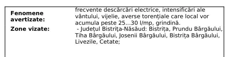 A fost emisă o avertizare Ro-Alert pentru mai multe localități din Bistrița-Năsăud.