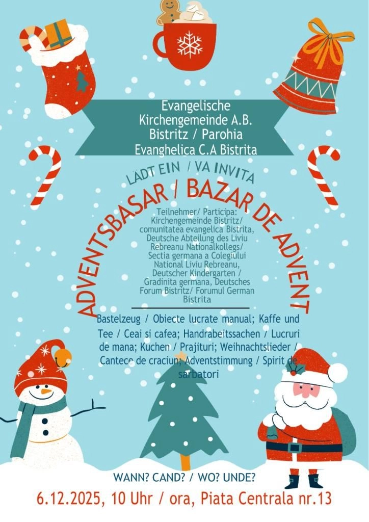 Parohia Evanghelică C.A. Bistrița invită comunitatea locală la tradiționalul Bazar de Advent! Acesta va avea loc sâmbătă, 6 decembrie 2025, de la ora 10:00, în curtea Parohiei Evanghelice C.A. din Piața Centrală nr. 13.