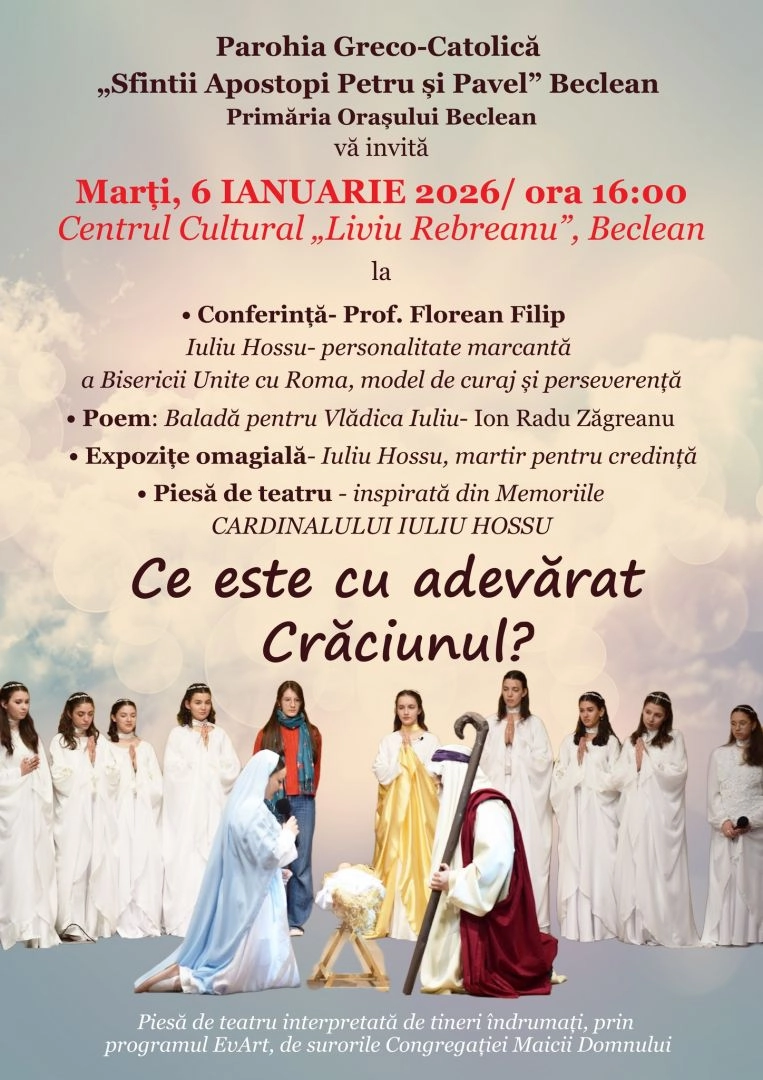 Marți, 6 ianuarie 2026, începând cu ora 16:00, Centrul Cultural „Liviu Rebreanu” din Beclean va găzdui evenimentul cultural și spiritual „Ce este cu adevărat Crăciunul?”, organizat de Parohia Greco-Catolică „Sfinții Apostoli Petru și Pavel” Beclean, în parteneriat cu Primăria Orașului Beclean și susținut de Eparhia Română Unită cu Roma, Greco-Catolică, de Cluj-Gherla, prin Biroul pentru Pastorația Tinerilor și a Copiilor.
