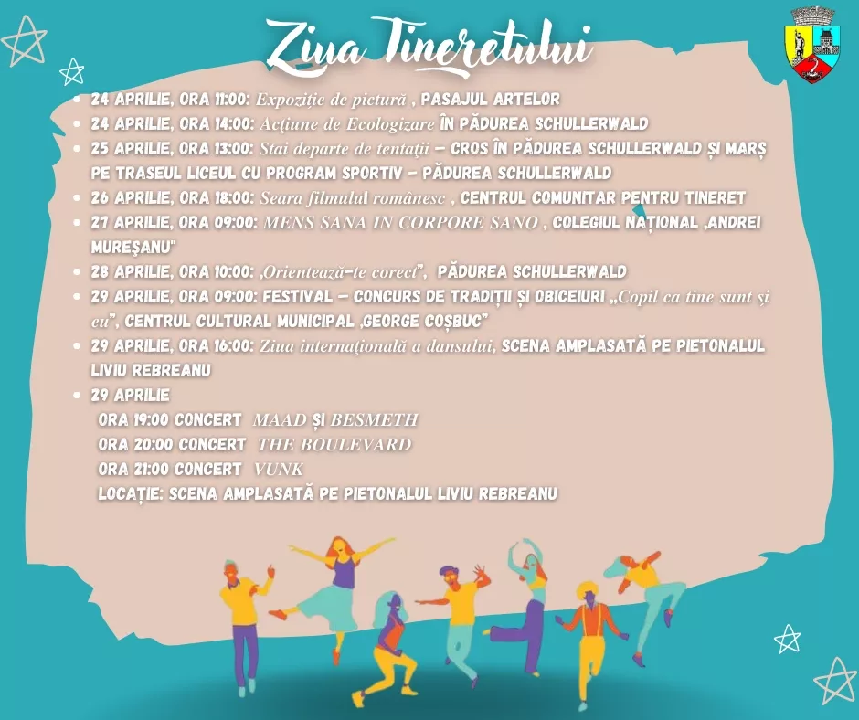 Primฤria municipiului Bistriลฃa organizeazฤ, รฎn perioada 24-29 aprilie 2023, o serie de activitฤลฃi recreativ-educative ลi de divertisment dedicate tinerilor, cu ocazia โZilei Naลฃionale a Tineretuluiโ care se sฤrbฤtoreลte รฎn data de 2 mai.