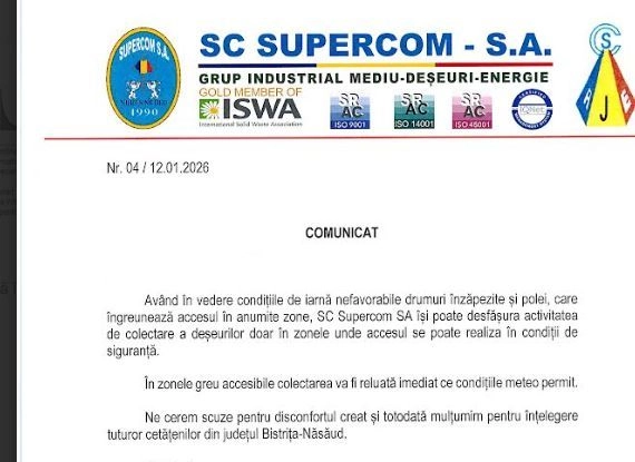 Operatorul de salubritate Supercom informează că, din cauza condițiilor meteo nefavorabile specifice sezonului rece — drumuri acoperite de zăpadă și formarea poleiului — accesul în anumite zone este îngreunat. În aceste condiții, colectarea deșeurilor se desfășoară doar în zonele unde intervenția se poate realiza în siguranță.