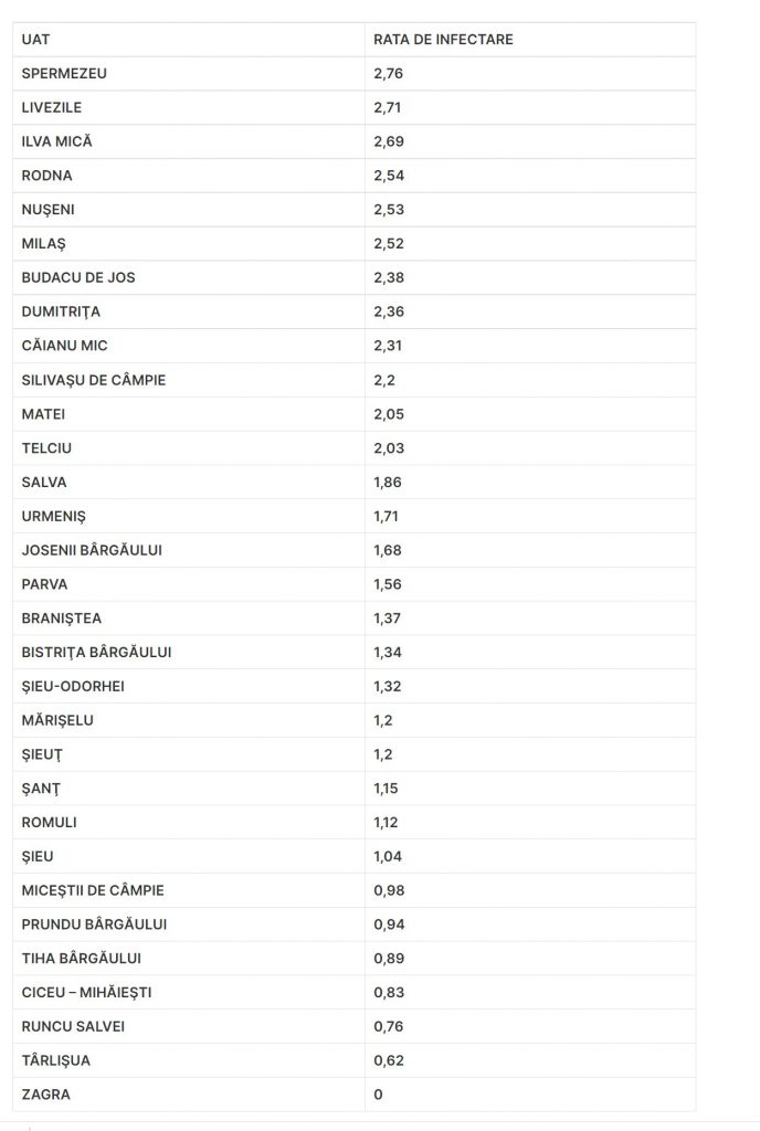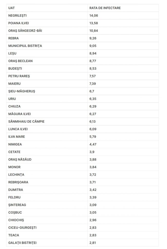 Se îngroașă gluma și în BN: Avem 195 de cazuri noi iar județul este în scenariul roșu. Bistrița a ajuns la o rată de infectare de 9,05, Sg. Băi la 10,84, Becleanul, 8,77. Negrileștiul se apropie de 15 infectați la mia de locuitori