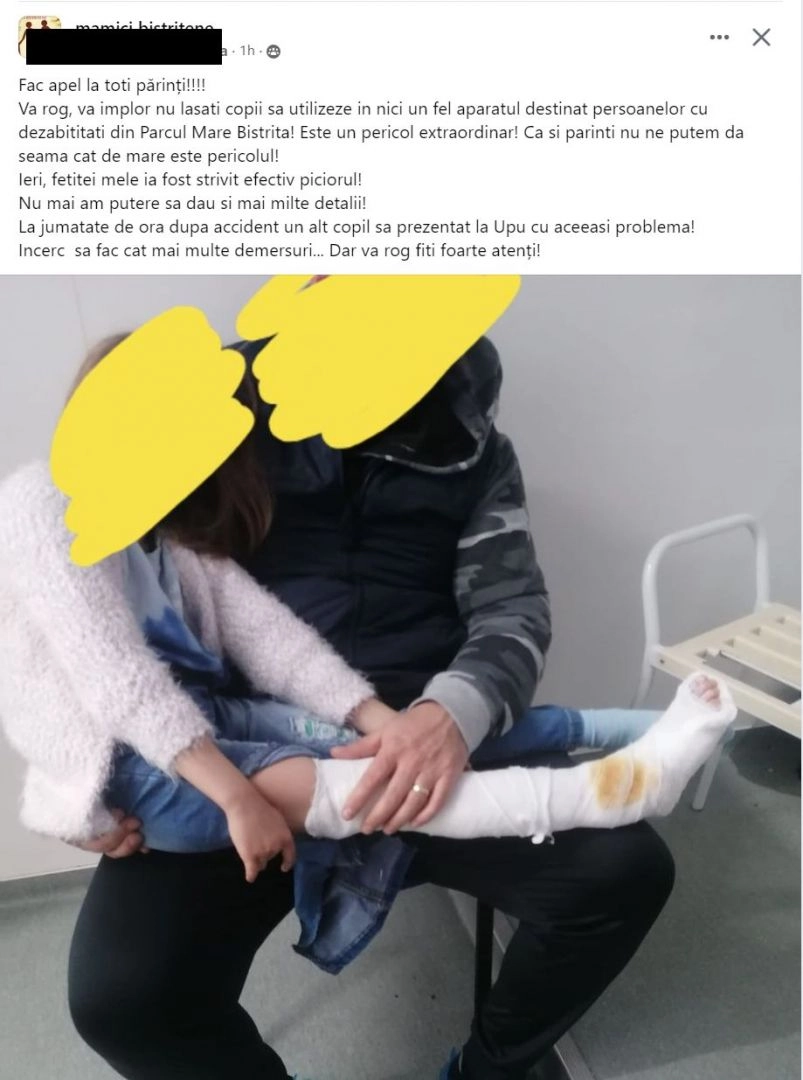 La UPU Pediatrie au ajuns ieri după-amiază, în data de 17 aprilie, doi minori accidentați la leagănul destinat persoanelor cu dizabilități din Parcul Municipal Bistrița.