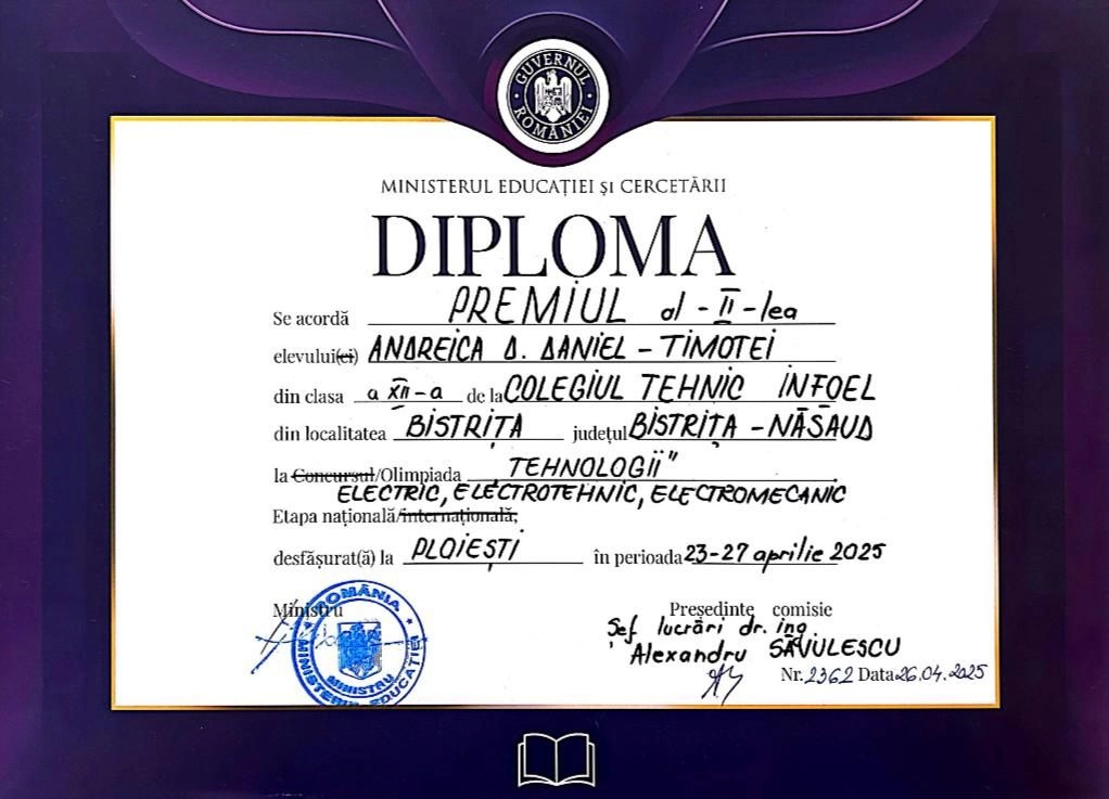 Elevii Colegiului Tehnic INFOEL din Bistrița au demonstrat încă o dată excelență în domeniul tehnic, obținând rezultate remarcabile la Olimpiada Națională de Tehnologii, desfășurată în perioada 23-27 aprilie la Liceul Tehnologic Energetic „Elie Radu” din Ploiești.