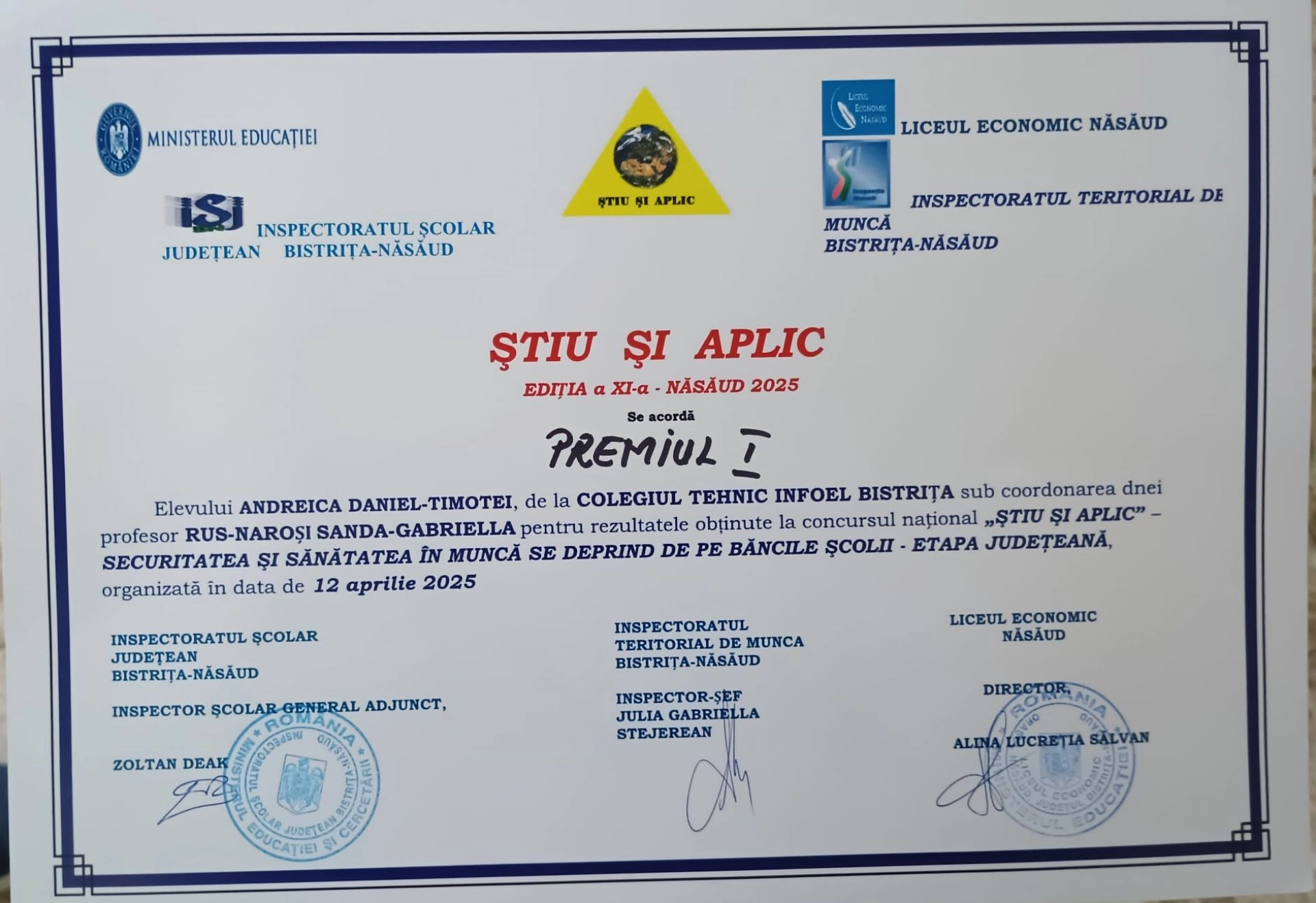 Județul Bistrița-Năsăud a fost reprezentat de doi elevi pasionați de domeniul electric: Daniel-Timotei Andreica (clasa a XII-a F) și Raul Ionatan Cioarbă (clasa a XI-a G). Ambii au concurat în calificarea Tehnician în instalații electrice, avându-i ca mentori pe profesorii Sanda Gabriela Rus-Naroși și Constantin Corneliu Rusu. Performanțele lor au fost remarcabile încă din etapa județeană, unde au ocupat locul I, ceea ce le-a asigurat participarea la faza națională. La acest nivel, Daniel-Timotei Andreica s-a clasat pe locul II, confirmându-și talentul și pregătirea riguroasă.