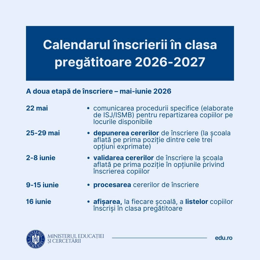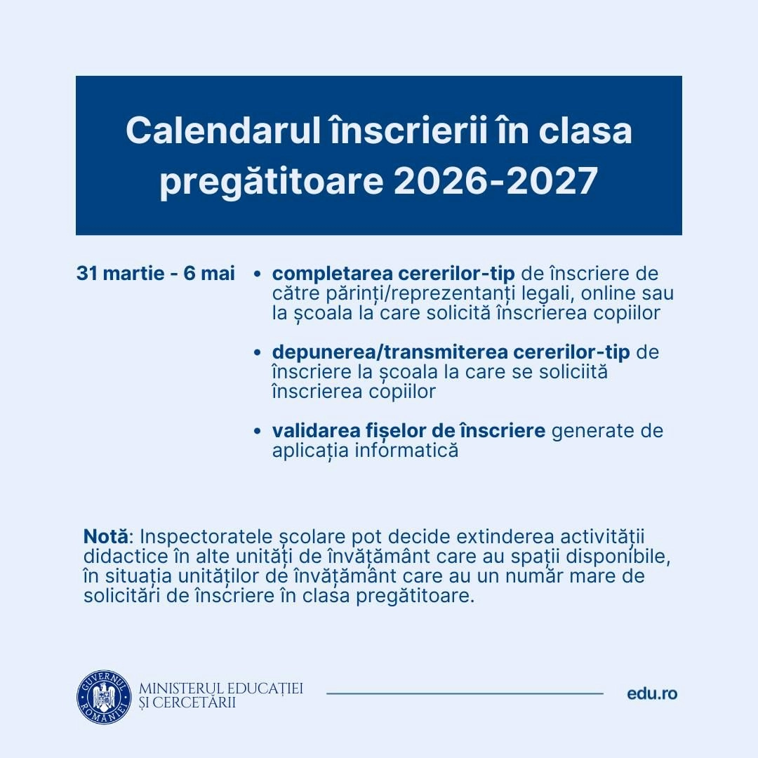 Calendarul pentru înscrierea copiilor în clasa pregătitoare în anul școlar 2026 – 2027 a fost aprobat.