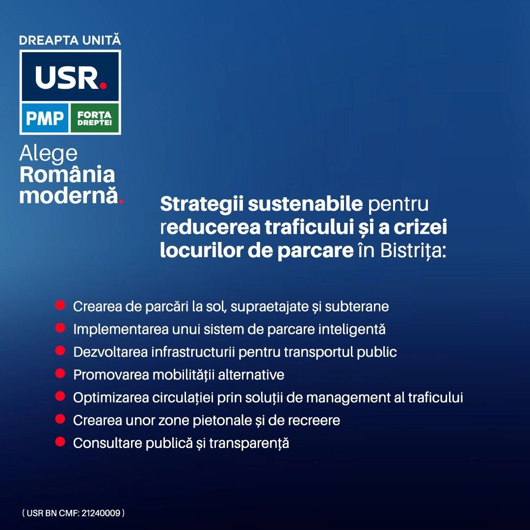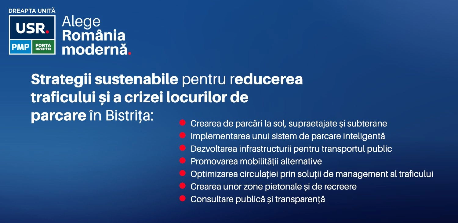 Lipsa locurilor de parcare și traficul aglomerat este o problemă reală în municipiul Bistrița, care nu poate să fie rezolvată de pe o zi pe alta, dar printr-o strategie integrată și sustenabilă, menită să genereze beneficii pe termen lung pentru întreaga comunitate reprezintă o prioritate.