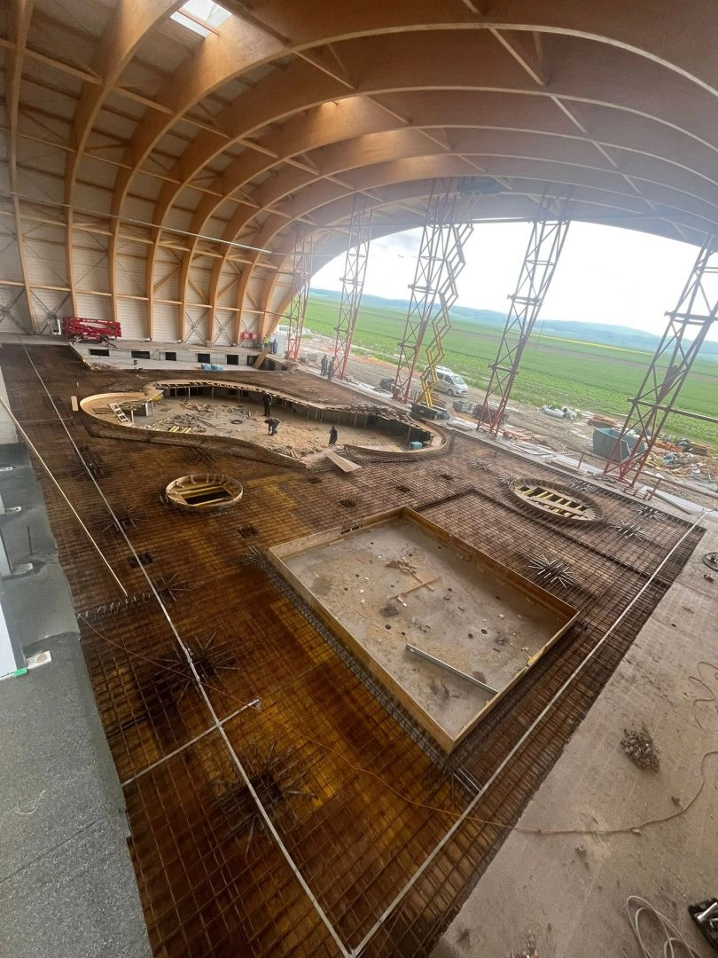 •Montarea carcaselor de buloane pentru arcele de lemn ce vor susține acoperișul - armare, cofrare și turnare curte de lumină exterioară Solarium.
