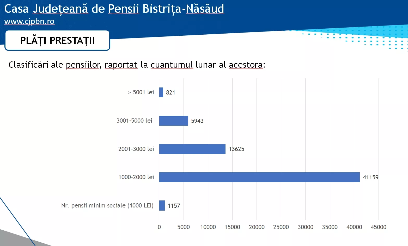La finalul anului 2022, în evidențele Casei Județene de Pensii Bistrița-Năsăud figurau peste 63.000 de pensionari, mai bine de jumătate dintre ei beneficiind de sume cuprinse între 1.000 și 2.000 de lei.