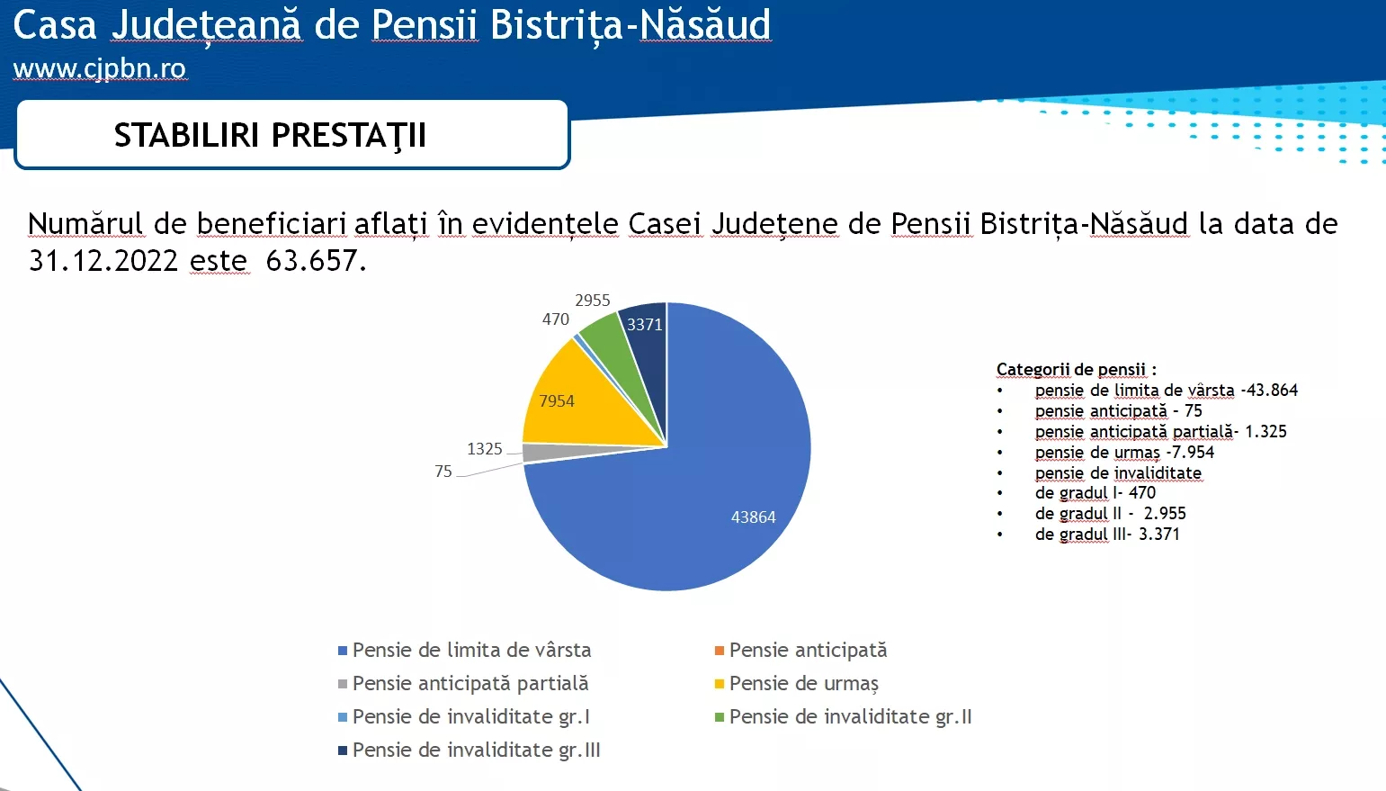 ”Numărul de beneficiari aflați în evidențele Casei Județene de Pensii Bistrița-Năsăud la 31 decembrie finele anului 2022 a fost de 63.657. Cei mai mulți sunt pensionari de limită de vârstă – 43.864”, a declarat directorul instituției, Sanda Vișan, în cadrul şedinţei din luna iunie a Colegiului Prefectural.