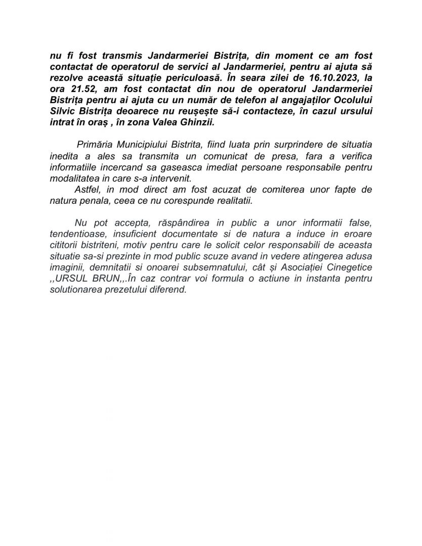 Primăria Bistrița și-a cerut scuze față de directorul Asociației Cinegetice Ursul Brun, Dumitru Cărhaț, după ce instituția a transmis, în urmă cu câteva zile, că acesta ar fi tras cu arma, motiv pentru care ursul s-ar fi speriat și ar fi ajuns în municipiu, în data de 14 octombrie.