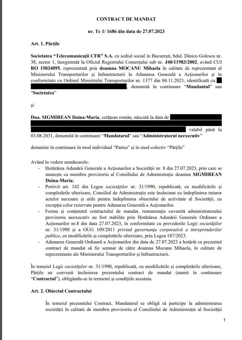 "Mandatarul are dreptul de a primi lunar pentru activitatea desfășurată în calitatea sa de Administrator provizoriu neexecutiv o remunerație lunară brută, sub forma unei indemnizații fixe, în cuantum de 11.457 lei, numai dacă cuantumul acesteia nu depăşeşte de două ori media pe 12 luni a câştigului salarial mediu brut lunar pentru activitatea desfăşurată conform obiectului principal de activitate, la nivel de clasă, conform clasificaţiei activităţilor din economia naţională", se arată în hotărârea prin care Doina Sigmirean a fost numită. Rămâne de văzut dacă Doina Sigmirean va continua pe această funcție la compania de stat, după expirarea contractului.