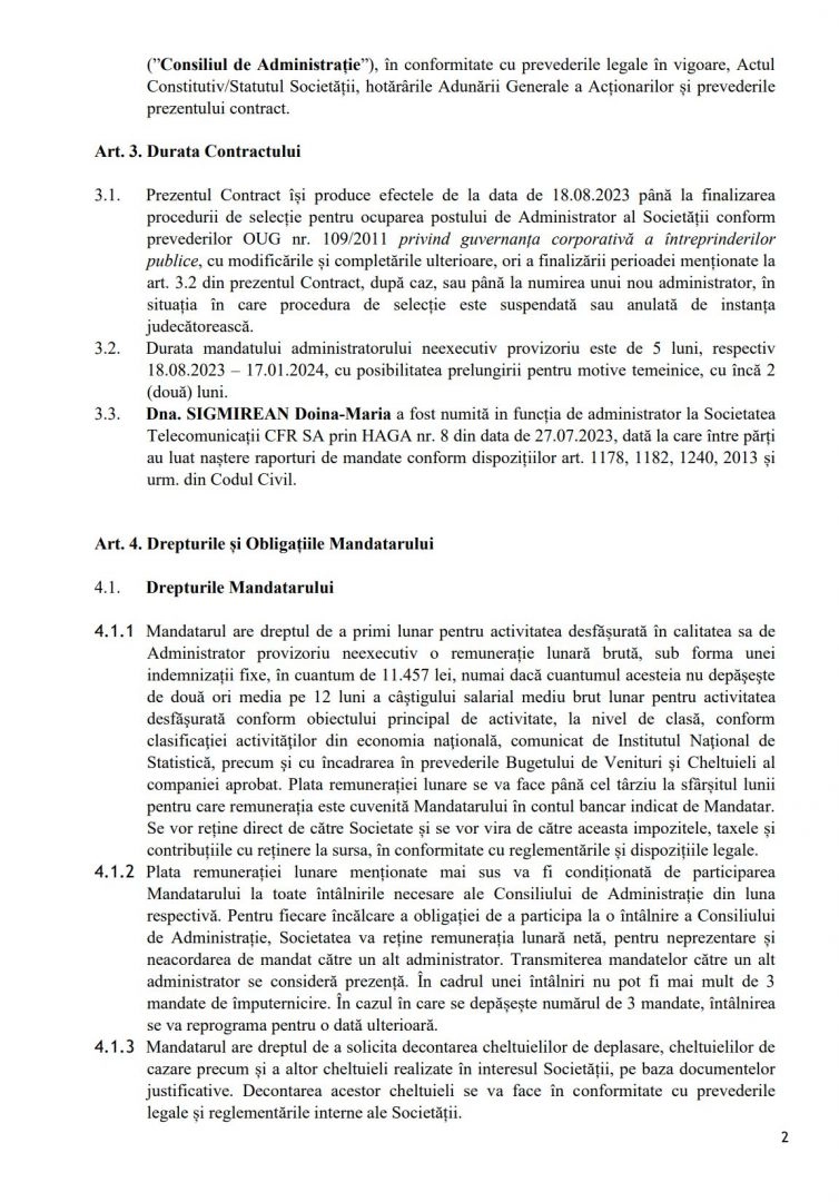 Durata mandatului administratorului neexecutiv provizoriu este de 5 luni, respectiv 18.08.2023 – 17.01.2024, cu posibilitatea prelungirii pentru motive temeinice, cu încă 2 (două) luni.