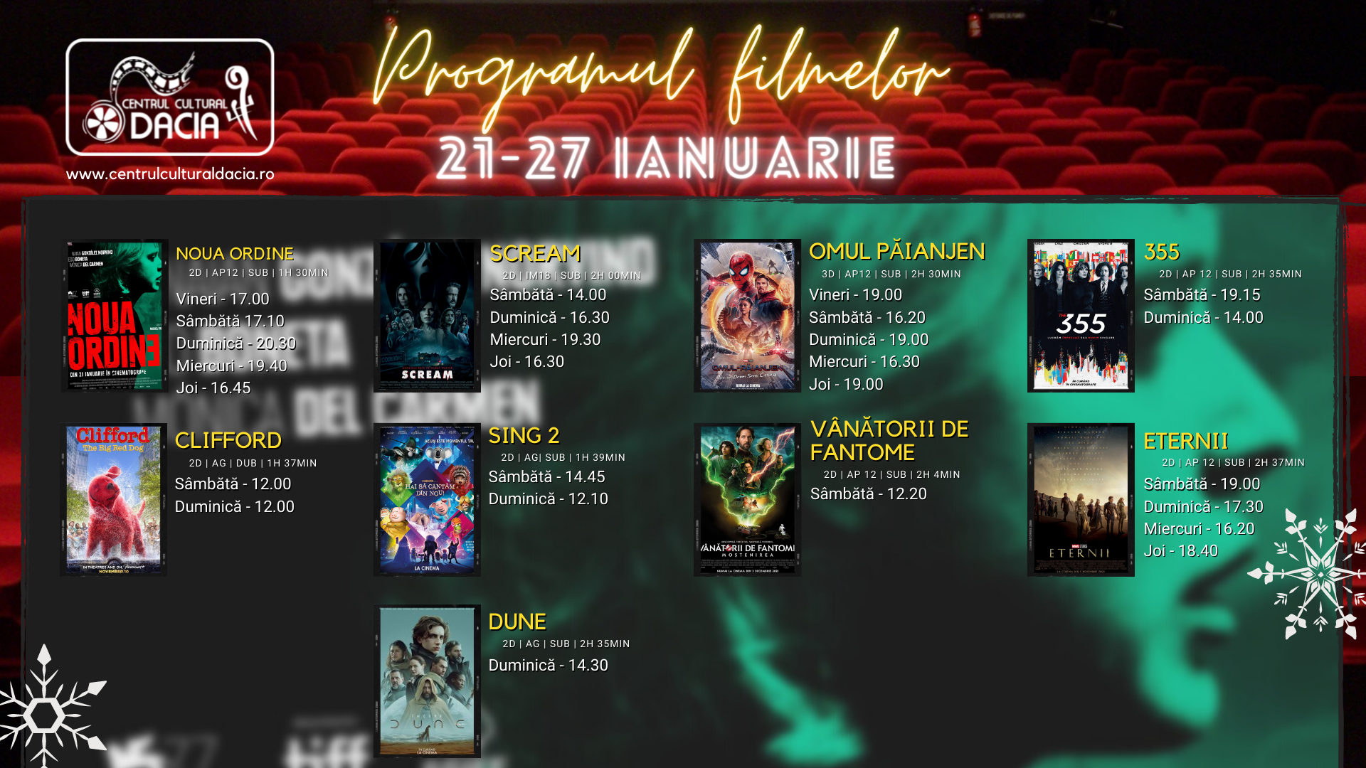 Programul filmelor la Centrul Cultural ”Dacia” din Bistrița, în perioada 21-27 ianuarie 2022