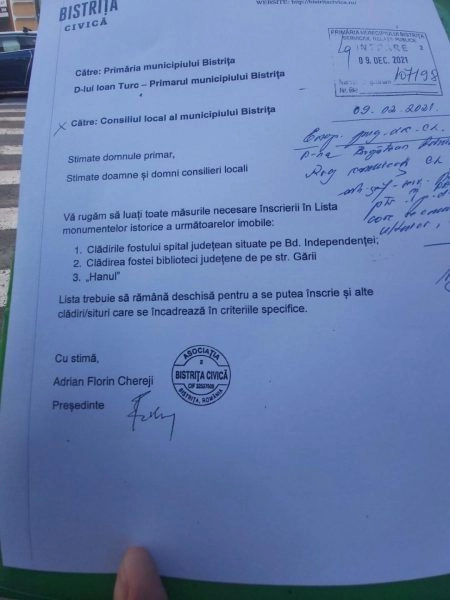 În luna decembrie 2021, , ”Bistrița Civică” a depus la primăria Bistrița o adresă în care s-a cerut trecerea pe lista de monumente istorice a mai multe imobile, după cum urmează: clădirile care au adăpostit cândva mai multe secții ale SJU ”Bistrița” situate pe Bulevardul Independenței, imobilul tot mai distrus al fostei Biblioteci situat vis-a-vis de SRI dar și de clădirea vechiului ”Han” din imediata apropiere a Spitalului Județean de Urgență (vezi facsimil).