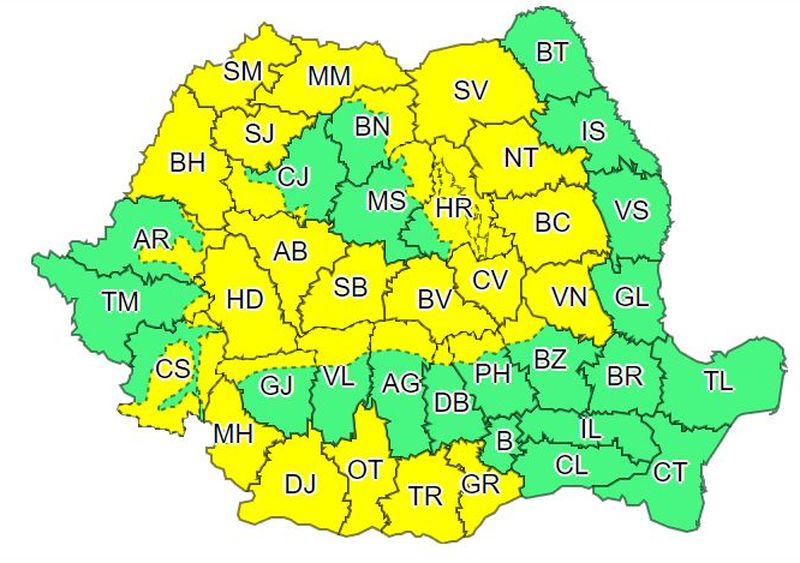 Meteorologii au emis avertizări cod galben și cod portocaliu pentru mai multe județe: