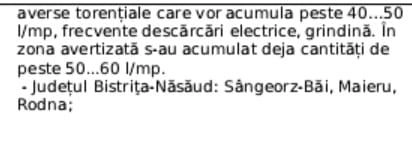Conform unei avertizări de fenomene meteorologice periculoase - *cod roșu - emise de Administrația Națională de Meteorologie, ISU Bistrița Năsăud a transmis un mesaj prin sistemul Ro-Alert, pentru mai multe localități din Bistrița-Năsăud.
