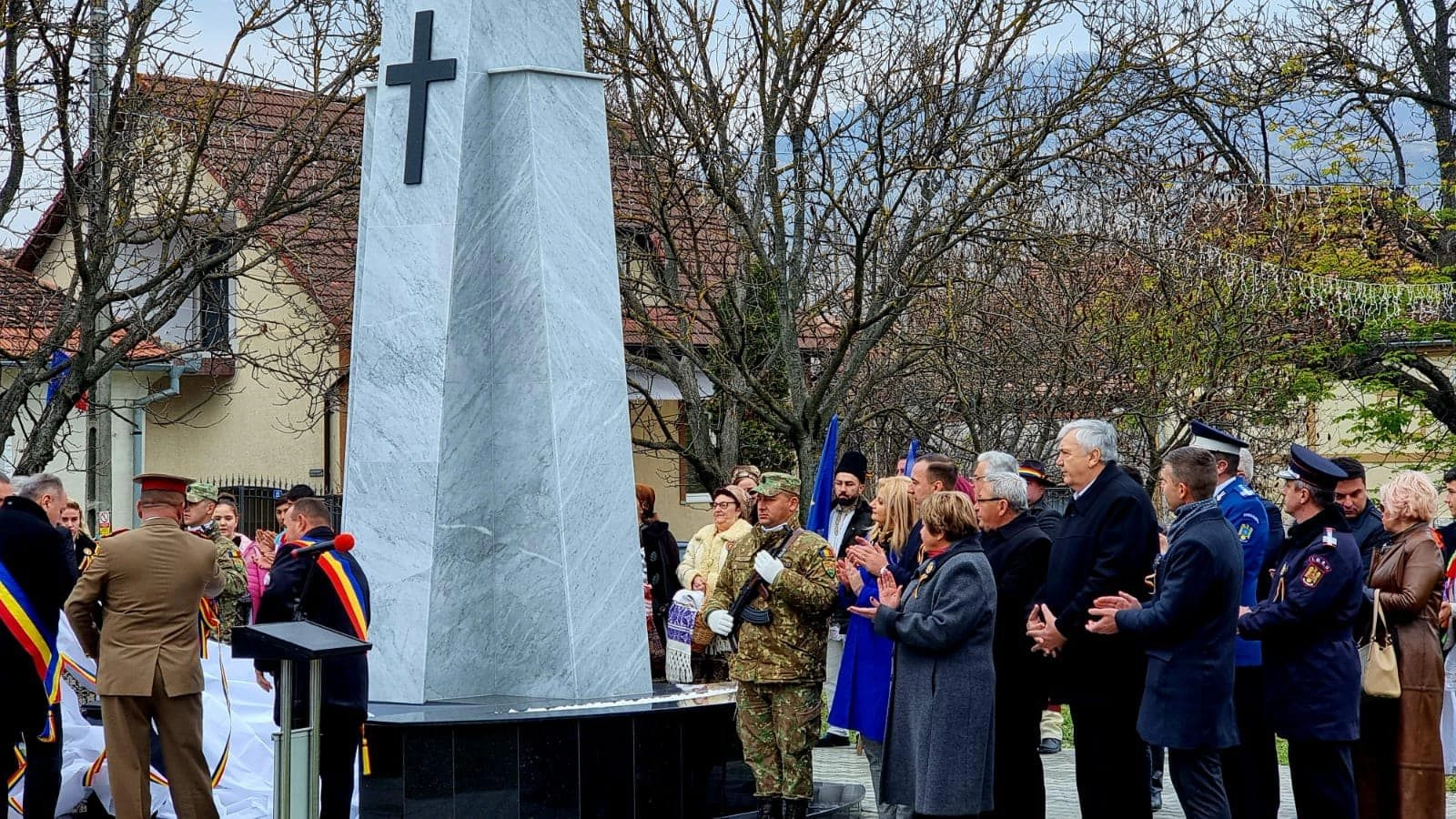 Ziua de astăzi este o zi deosebită pentru comunitatea din Comuna Teaca, Bistrița-Năsăud, deoarece acest monument este al tuturor oamenilor, indiferent de apartentența religioasă, etnică, politică, motiv pentru care, iată, se adeverește că în acest loc binecuvantat de Dumnezeu conviețuiesc cu respect unii față de alții, români, unguri, sași și romi care apațin unui număr de 8 confesiuni religioase. Doresc să-i felicit pe toți cei care au contibuit la realizarea acestui monument, pe aceia care s-au ocupat de organizarea zile de astăzi, militarilor din cadrul Batalionului 812 Infanterie Bistrița de la Brigada 81 Mecanizată "General Grigore Bălan", elevilor de la Liceul Teoretic "Constantin Romanu Vivu" Teaca, tinerilor de la Ansamblul folcloric"Cununa graului" - Ocnita, Bistrita Nasaud și pe toată lumea prezentă"