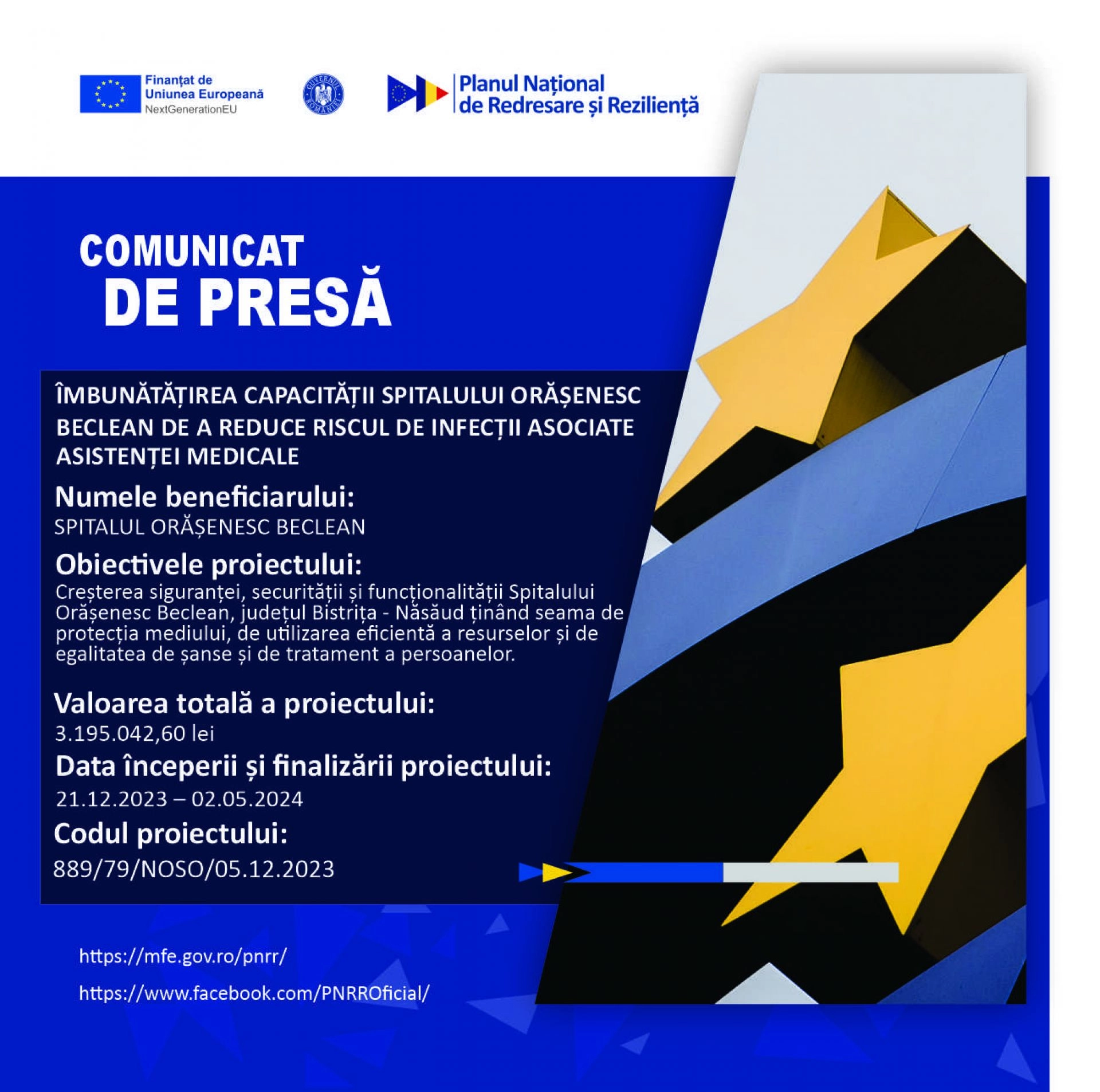 COMUNICAT DE PRESĂ. Îmbunătăţirea capacităţii Spitalului Orăşenesc Beclean de a reduce riscul de infecţii asociate asistenţei medicale