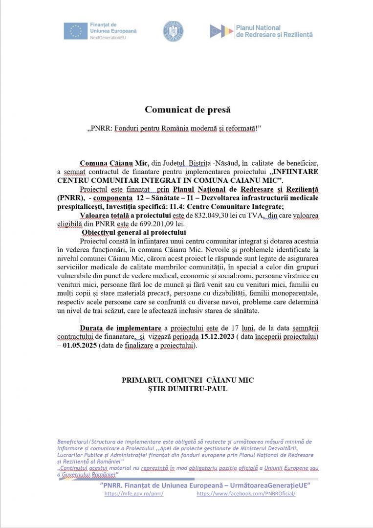 COMUNICAT de presă. Primăria comunei Căianu Mic - „PNRR: Fonduri pentru România modernă și reformată!”