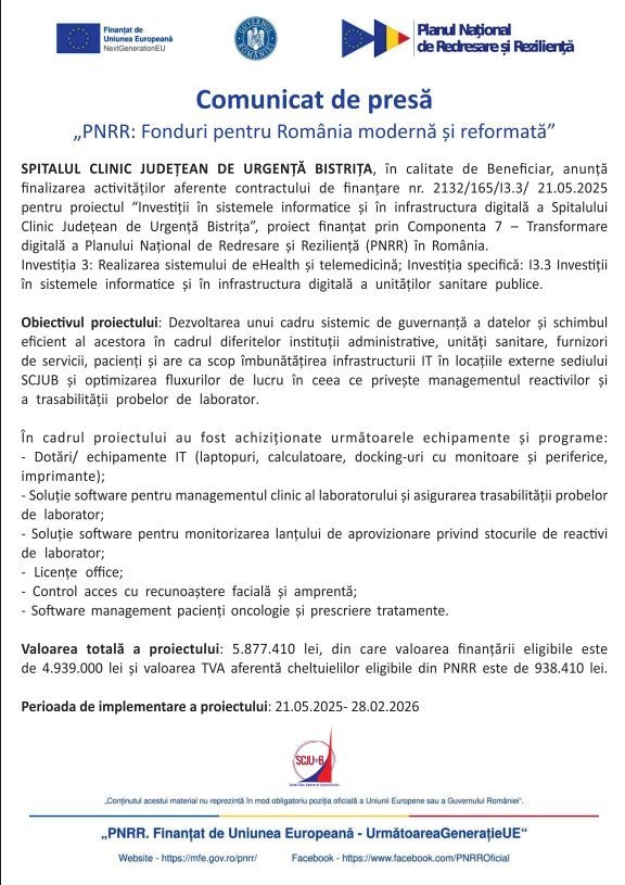 Comunicat de presă privind începerea proiectului: PNRR - Fonduri pentru România modernă și reformată