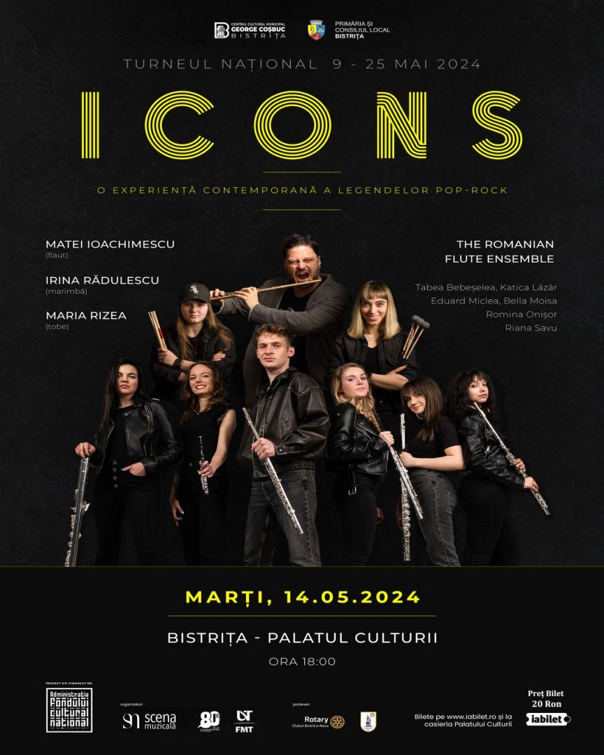 Matei Ioachimescu, unul dintre cei mai virtuozi flautiști ai momentului, pregătește turneul național ICONS în perioada 9-25 Mai 2024. El invită publicul din nouă orașe (Timișoara, Sibiu, Cluj Napoca, Bistrița, Baia Mare, Brașov, Buzău, Ploiești și București) la un spectacol palpitant ce promite să redefinească experiența unui concert obișnuit. Modelarea muzicii unor nume “iconice” precum Michael Jackson, Queen, Deep Purple, Pink Floyd, Guns N’ Roses sau Aerosmith capătă noi dimensiuni creative datorită unui grup cameral original: mini-orchestră de flaute, marimbă bas și tobe. Alături de Matei Ioachimescu, artist (re)cunoscut al scenelor internaționale, care, prin interpretarea sa spontană și creativă și prin felul în care transmite emoția și interacționează cu publicul, este considerat un adevărat ”rockstar” al muzicii clasice, se vor afla pe scenă marimbafonista Irina Rădulescu - singurul artist român de rang internațional dedicat acestui instrument, The Romanian Flute Ensemble (format din flautiștii Tabea Bebeșelea, Katica Lázár, Eduard Miclea, Bella Moisa, Romina Onișor și Riana Savu) și Maria Rizea la tobe, muzicieni cunoscuți publicului datorită unor proiecte de succes precum “Legends”, “inSuflu”, “La Vida Loca” sau “Marimba-The Journey”. Creativitatea și virtuozitatea sunt atributele esențiale ale proiectului ICONS, rezultate ale colaborării dintre artiști și compozitori de prestigiu precum Gabriel Almași, Dande Popescu, Ciprian Pop, Mihai Popean, Jorge Rojas și Aurelian Băcan. O altă misiune a acestui proiect itinerant este cea de descoperire și formare de tinere talente, prin organizarea de ateliere și cursuri de măiestrie cu artiștii implicați.