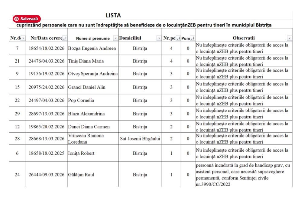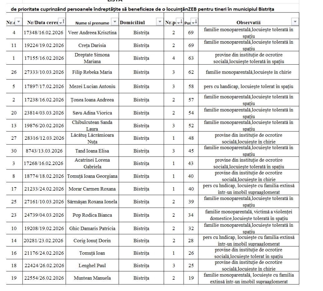 În fruntea clasamentului se află două solicitante cu același punctaj, urmate de alți tineri aflați în situații vulnerabile, precum familii monoparentale, persoane provenite din sistemul de protecție socială sau persoane cu dizabilități.
