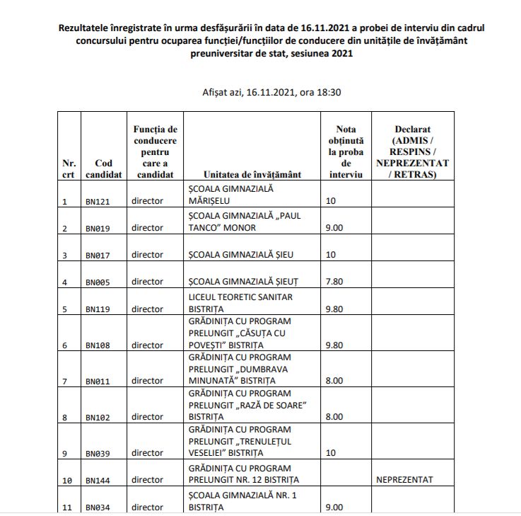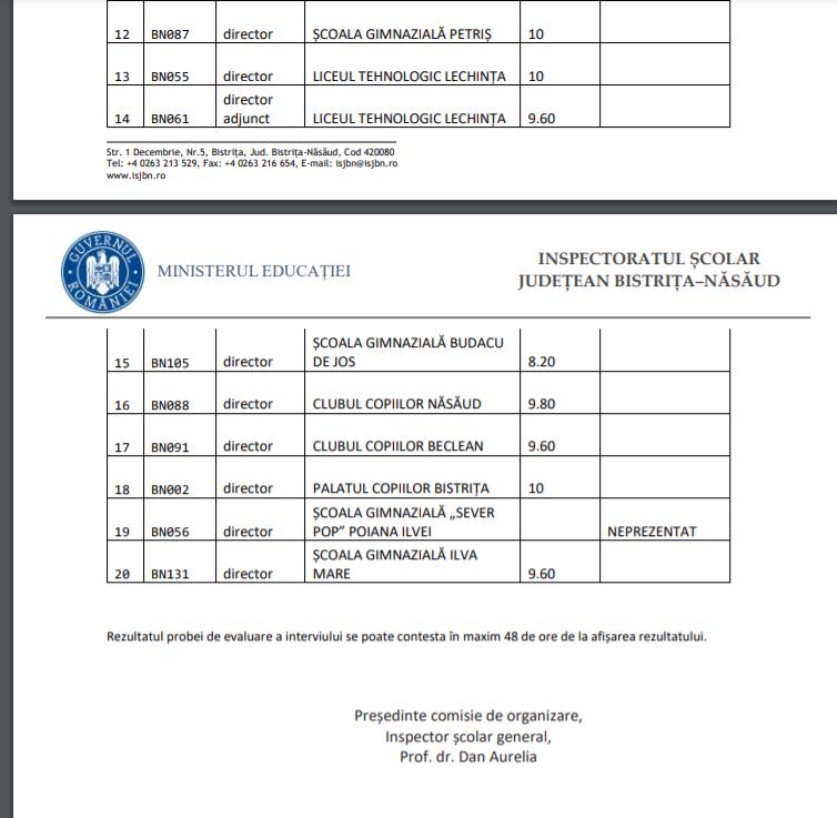 Inspectoratul Școlar Județean a afișat rezultatele după prima zi de interviuri, din cadrul concursului pentru posturile de directori de școli și directori adjuncți de școli din județul Bistrița-Năsăud. În prima zi, 20 de candidați trebuiau să susțină interviul, iar doi nu s-au prezentat. Șase dintre candidați au obținut note maxime, 10.