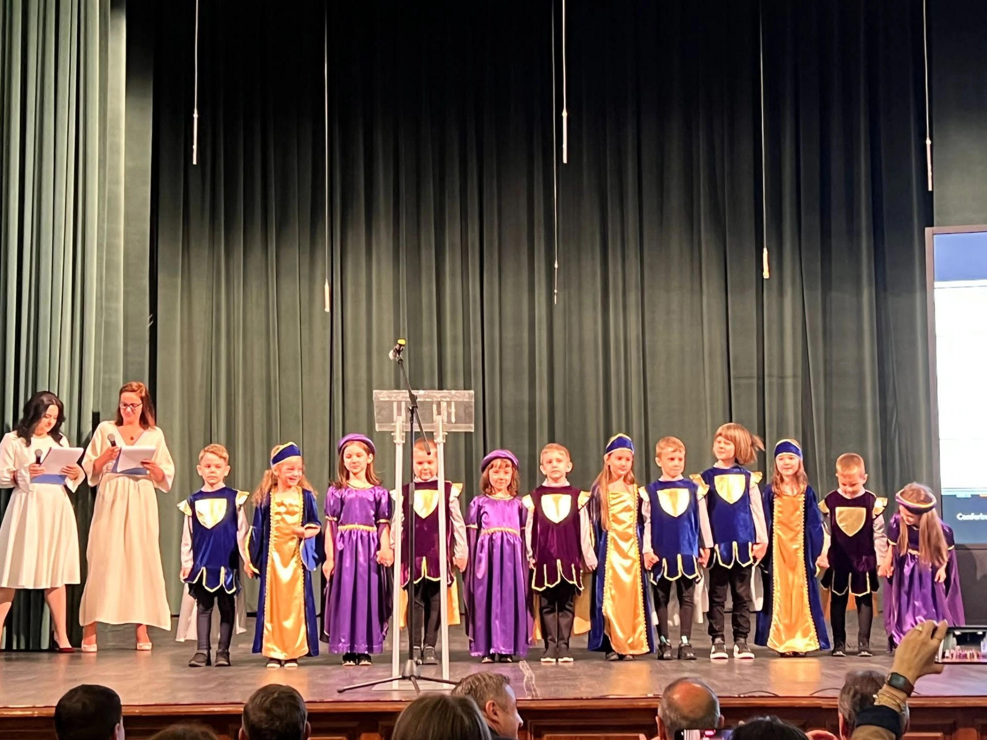 A urmat un moment special clădit pe istoria orașului nostru, oferit de formația MINI NOSA care an de an aduce bucurie și nostalgie prin dansul domnițelor și cavalerilor, coordonată cu măiestrie de doamnele educatoare Prof. Andreea Sima și Prof. Diana Rus.