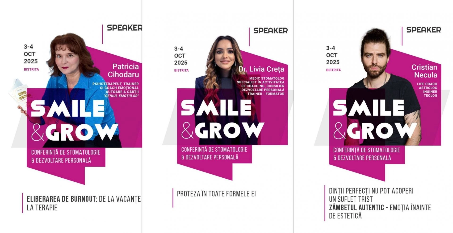 Sâmbătă, 4 octombrie 2025, începând cu ora 09:00, la Hotel Diana din Bistrița, Dr. Livia Creța te invită la un eveniment dedicat echilibrului interior, reconectării cu sinele și regăsirii zâmbetului autentic: Conferința SMILE & GROW.