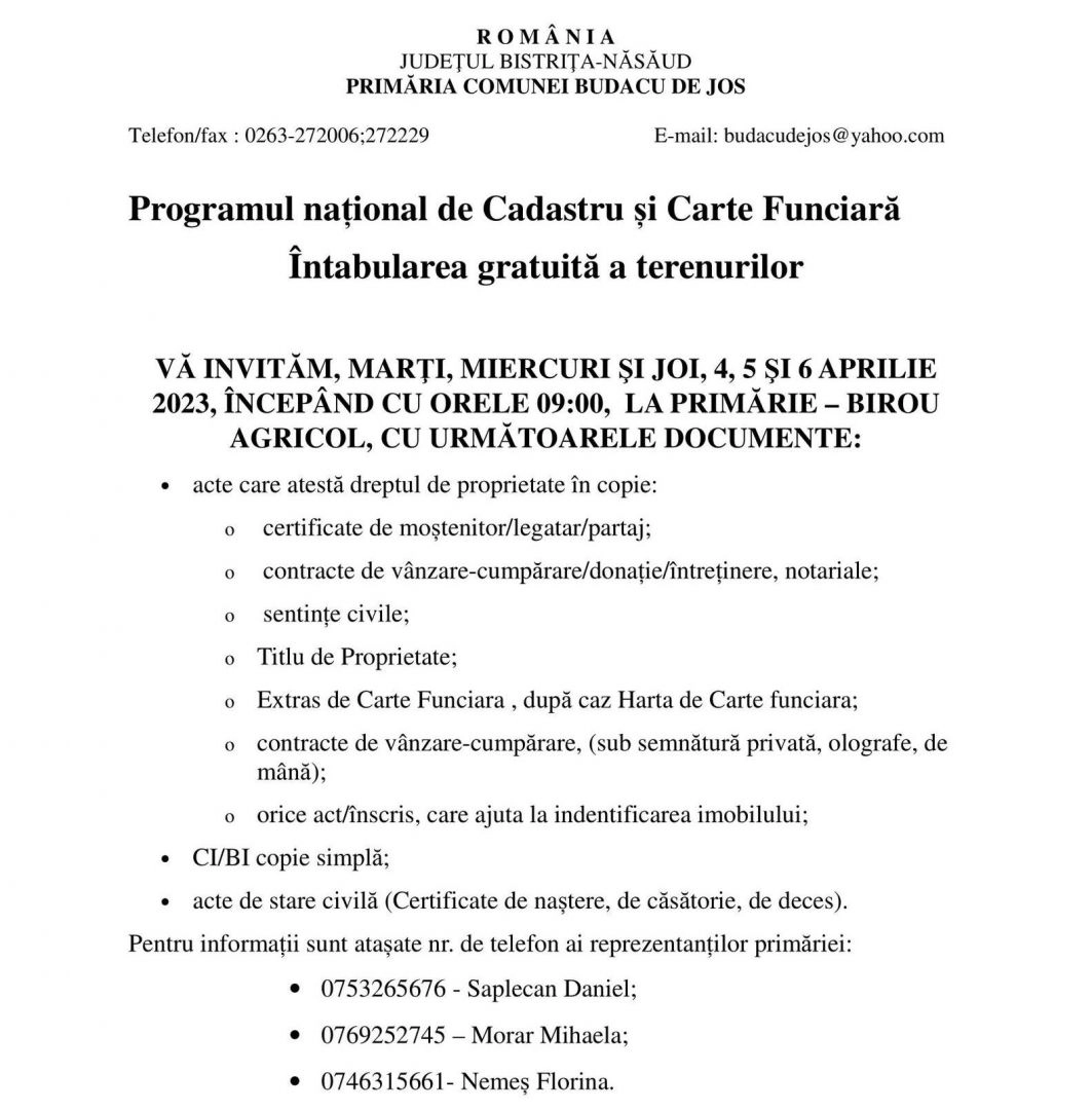 În Comuna Budacu de Jos continuă Programul Național de Cadastru și Carte Funciară respectiv intabularea gratuită a tuturor imobilelor, terenuri (intravilan, extravilan, agricol, neagricol etc.) și construcții (case, anexe etc.).