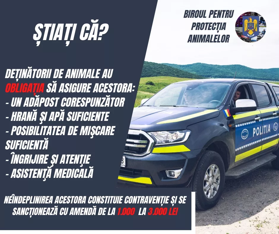 Reamintim faptul că, în conformitate cu art. 5 din Legea 205/2004, deținătorii de animale au obligația de a asigura acestora, în funcție de nevoile etologice, specie, rasă, sex, vârstă și categorie de producție, următoarele: