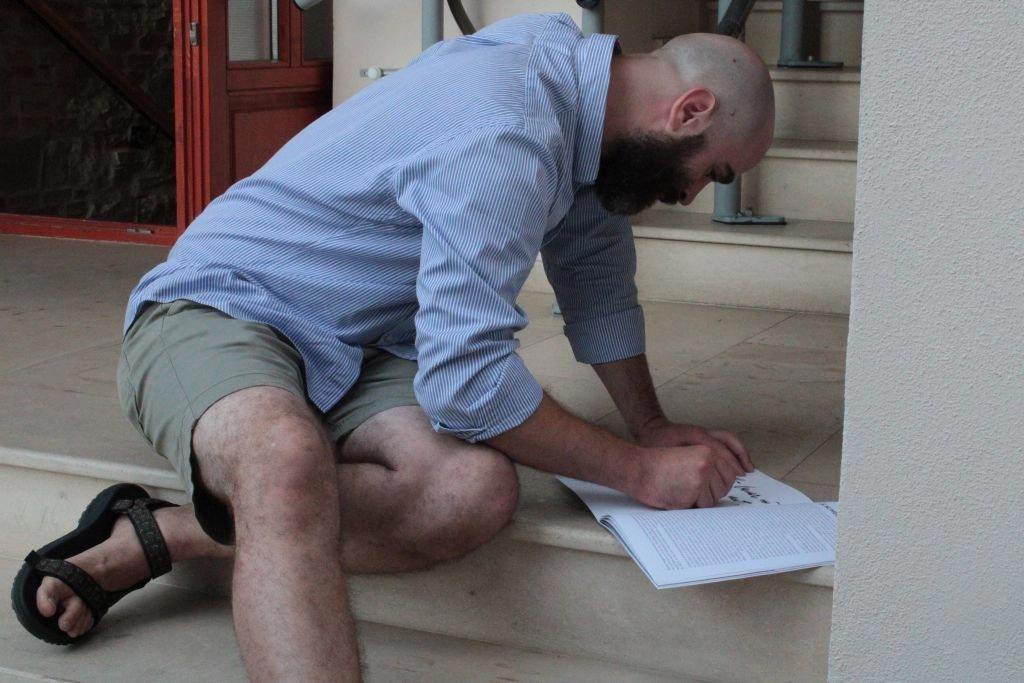 În locul unui discurs cu prilejul vernisajului, Emilian Mocanu și-a luat prin surprindere publicul: a preferat să încropească un happening – oferind celor prezenți o lucrare de grafică realizată pe loc.