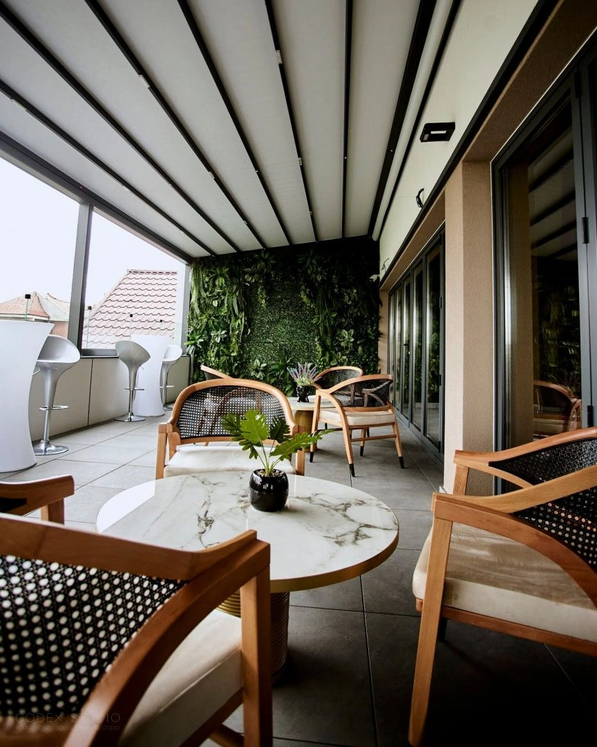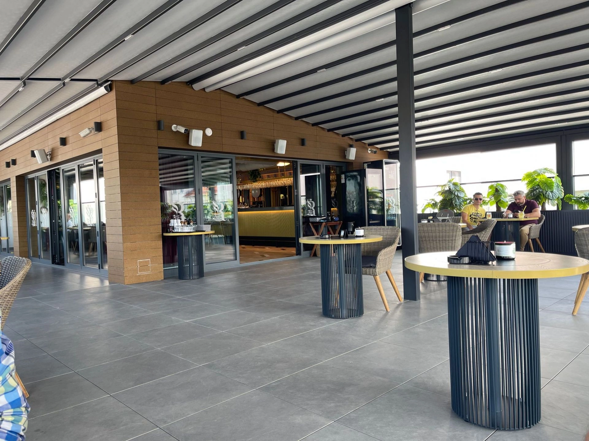 Mobilierul e frumușel, nu mi-am dat seama încă dacă e scump sau doar vrea să pară scump, cu auriu pe mese, gresie gri pe terasă, negru pe decor. Băile arată bine, dacă aveți vreodată bani să mergeți în local, e important de știut că ușile de la baie se deschid cu un senzor din dreapta, ca să nu trageți ca țăranii de ele.