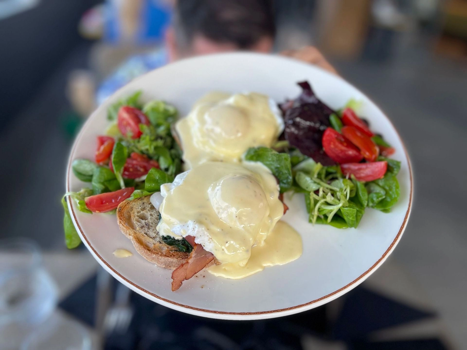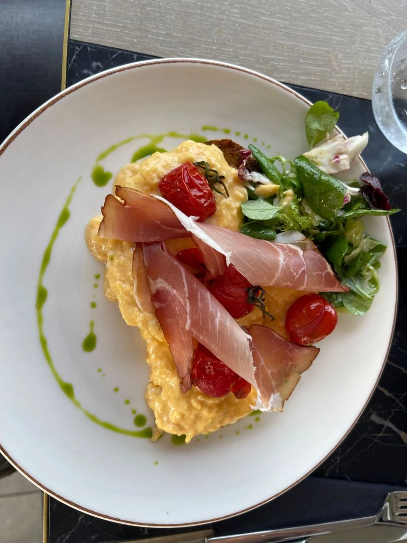 Aș fi mâncat o salată, dar bucătarii erau setați doar pe mic-dejun la ora aia, așa că mi-am luat o omletă. A fost bună, dar nu vă așteptați la omleta clasică. A avut multă pâine prăjită, ouă peste și prosciutto, cu salată. Porția e suficientă pentru un mic dejun. Mie mi-a plăcut, deși unul dintre prietenii mei de la masă s-a luptat puțin cu pâinea prăjită de la ouăle poșate pe care le-a comandat, dar a răzbit până la urmă.