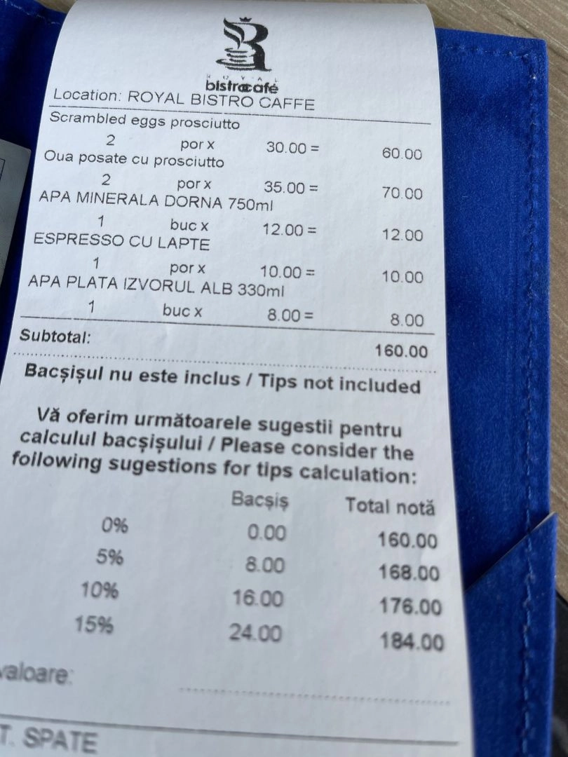 Cafeaua e, de asemenea, destul de bună și apa plată...e ca apa plată. Prețurile sunt acceptabile, puțin mai mari decât în majoritatea restaurantelor din Bistrița dar, vorba aia, dai un ban ca să fii la înălțime. În meniu, găsești multe feluri de mâncare, de la paste (37 - 50 de lei), salate (35 de lei), până la burgeri (42 de lei), vită (140 de lei) sau dorada (65 de lei).