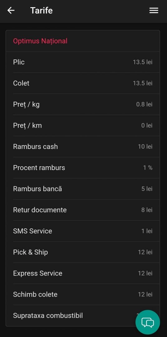 De menționat că prețurile/tarifele pentru coletele sau plicurile pe care le trimiți apar în aplicație, în meniul din dreapta-sus. Tot acolo, ai un borderou de rambursuri, o secțiune cu facturi (eu am primit factura pe email) și datele contului tău.